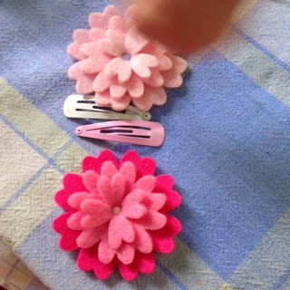 Then she fluffed the flowers up and threaded the prongs of the brads into the back of the clip.