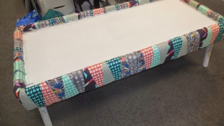 I turned the table right way up and stretched the fabric up over the foam and onto the inside edge of the coffee table side and stapled in place - it is a little tricky and you may need an extra pair of hands to get started -