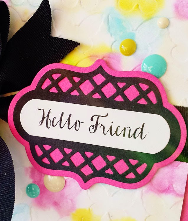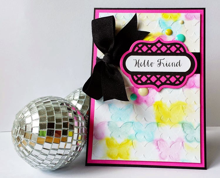 Besides from the label with the sentiment, I tied a large black bow around the patterned paper and added some enamel dots in colours similar to the once I used to colour the butterflies. Everything was then mounted on pink cardstock and added to a black card base.