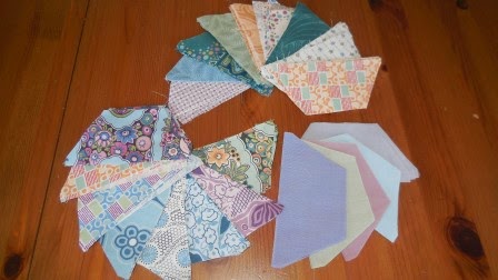 So now I have to work out how to stitch them together - by making each pinwheel - or by creating triangles which can then be stitched quickly by machine - but this will entail careful planning - so I think I'll go and make a cup of tea and then see if I can plan the lay out - it may take a while - so you'll have to wait until next week to see how I fair!!!