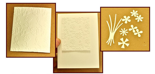 I started by embossing the rectangle of white card and attaching it to the base card about 10mm from the top left hand corner. Next I cut all of the elements to create the bouquet from the same white cardstock.