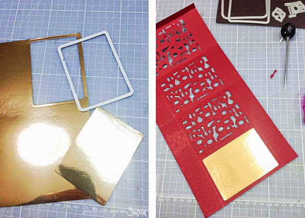 I used the same die to die cut a shiny mirri gold card to add more reflection to the light and attached it to the back panel.