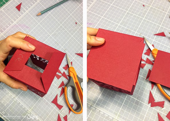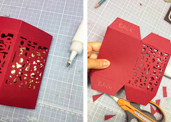To assemble the box I trimmed the tabs to make the folds better, as well as the bottom to become thinner so that I could place the battery operated tea light. I glue the little 5th panel o the back using wet adhesive for a strong hold.