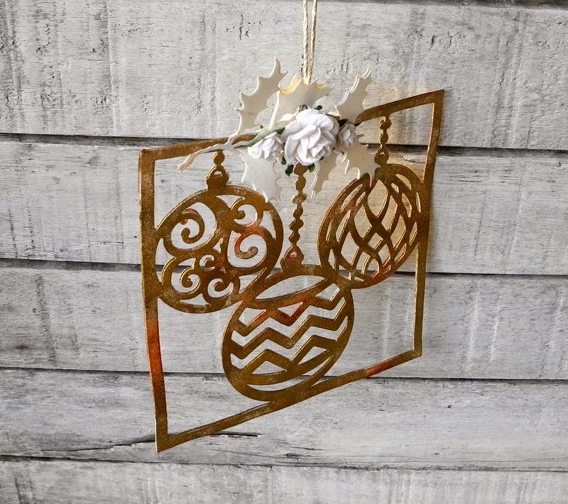I die cut the dies 2 pieces and glued them together to make it thicker.Then I emboss using gold embossing. I die cut Holiday greens and decorat the top front and back