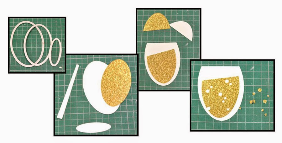 I chose three suitable ovals and set about my task by die cutting two ivory ovals and one from gold glitter card before adding a tapered strip of ivory card. I trimmed the top off the large ivory oval along with the gold oval before punching a few holes in the gold ovals with a Crop-a-Dile leaving the resulting glitter circles for later.
