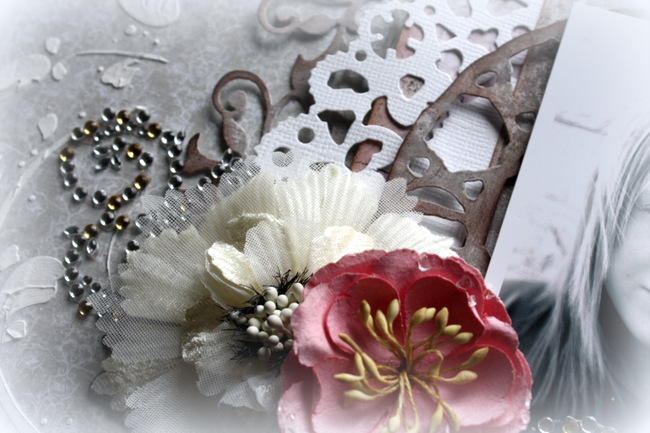 Bakom fotot har jag använt Weathered Clock die. Och i lager bakom klockan har jag använt Distressed Doily die och Botanical & Rose Garden die. Jag använde till slut några blommor, bling och alfabetssticker för att slutföra layouten.