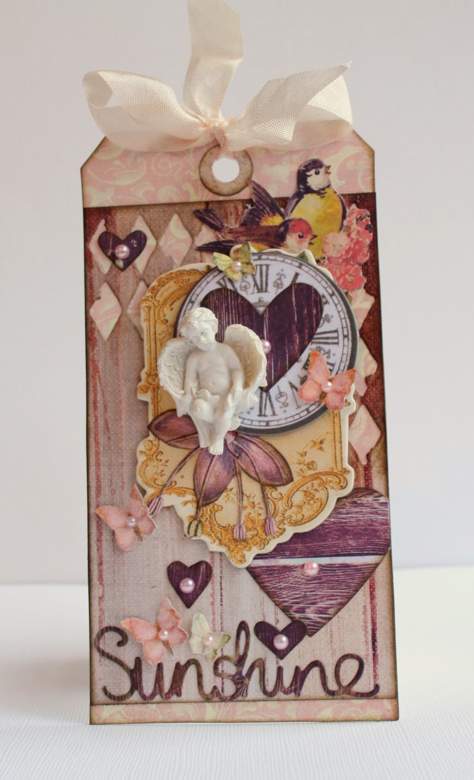 Ik heb mijn tag verder versierd met hartjes die zijn uitgestanst met de Heartfelt die. Ik heb twee grote harten gebruikt en een aantal kleinere hartjes. Daar heb ik roze pareltjes aan toegevoegd om ze eleganter te maken. Uiteindelijk heb ik ook nog het word "Sunshine" verwerkt onderaan op mijn tag. Dit woord is uitgestanst met de mooie "Happiness Phrase Set".