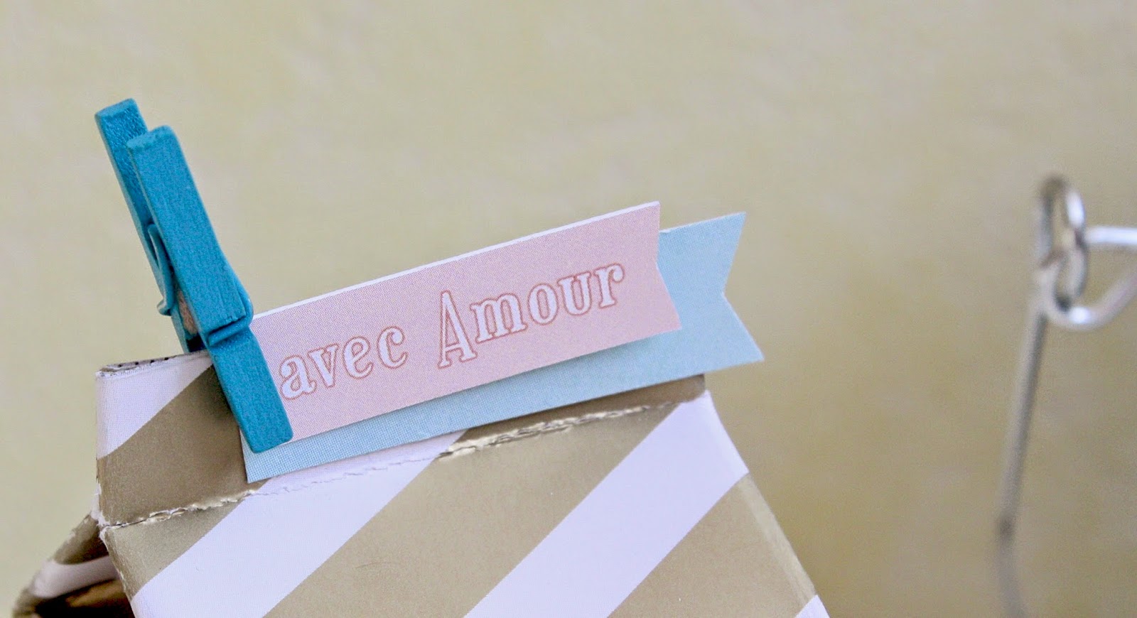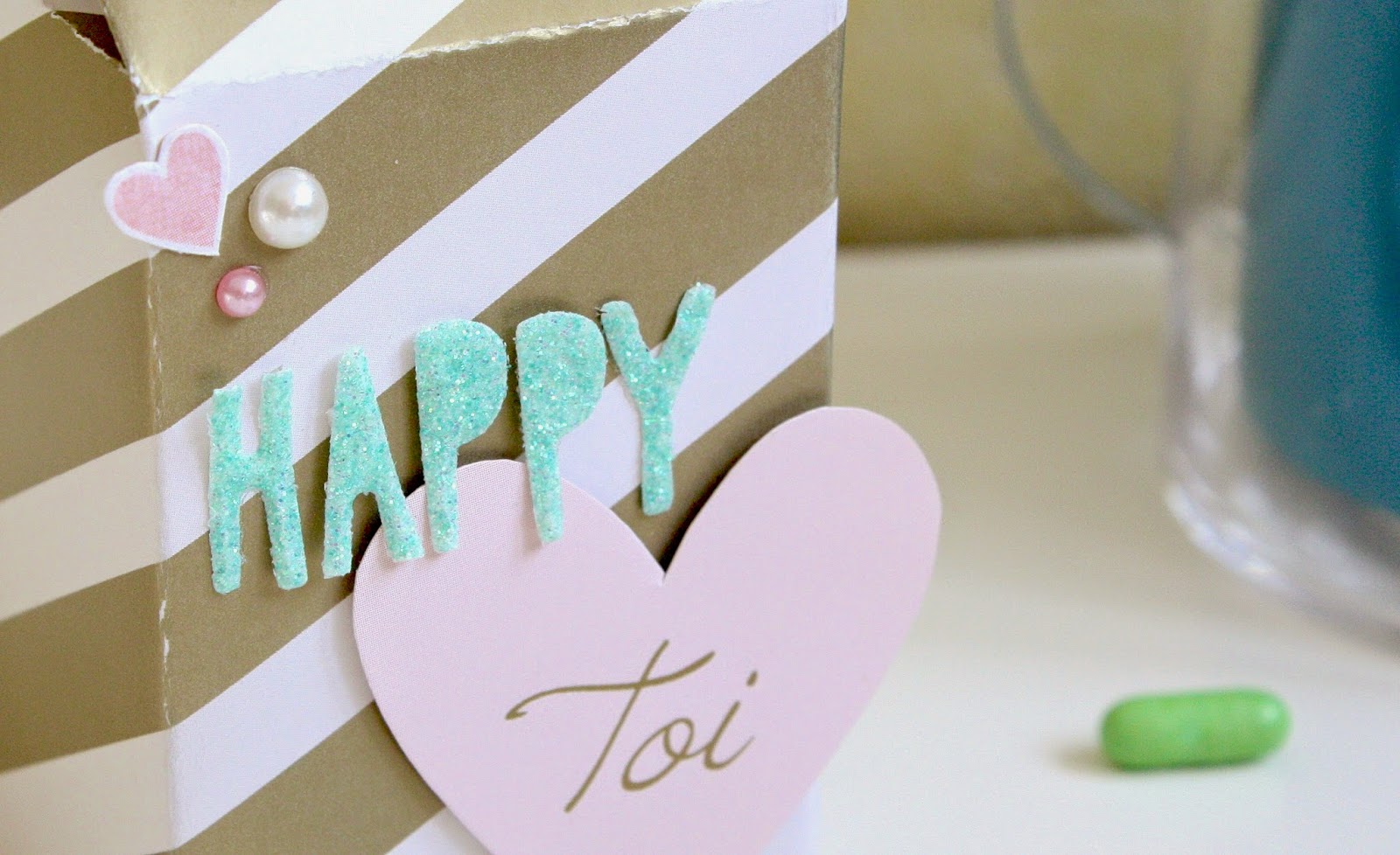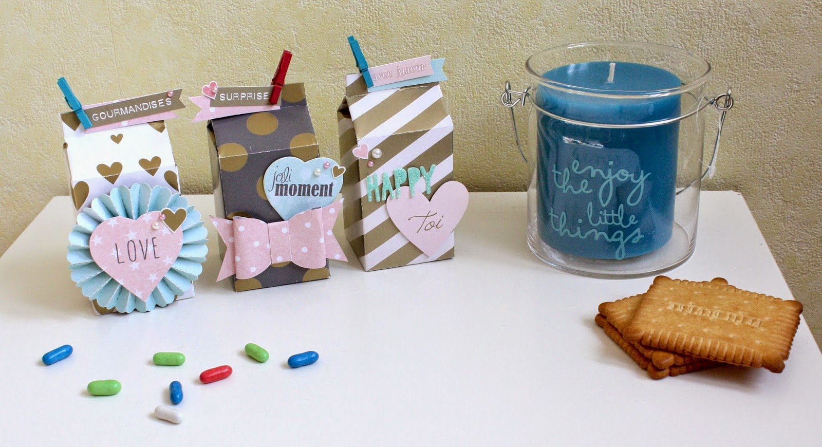 To decorate the trio of boxes, I played with volumes using the Die rosette and knot to create relief. I used pastel colours to soften the gilt, and a glitter adhesive tape for the Happy cut in order to remind the sparkling side of the gilt.