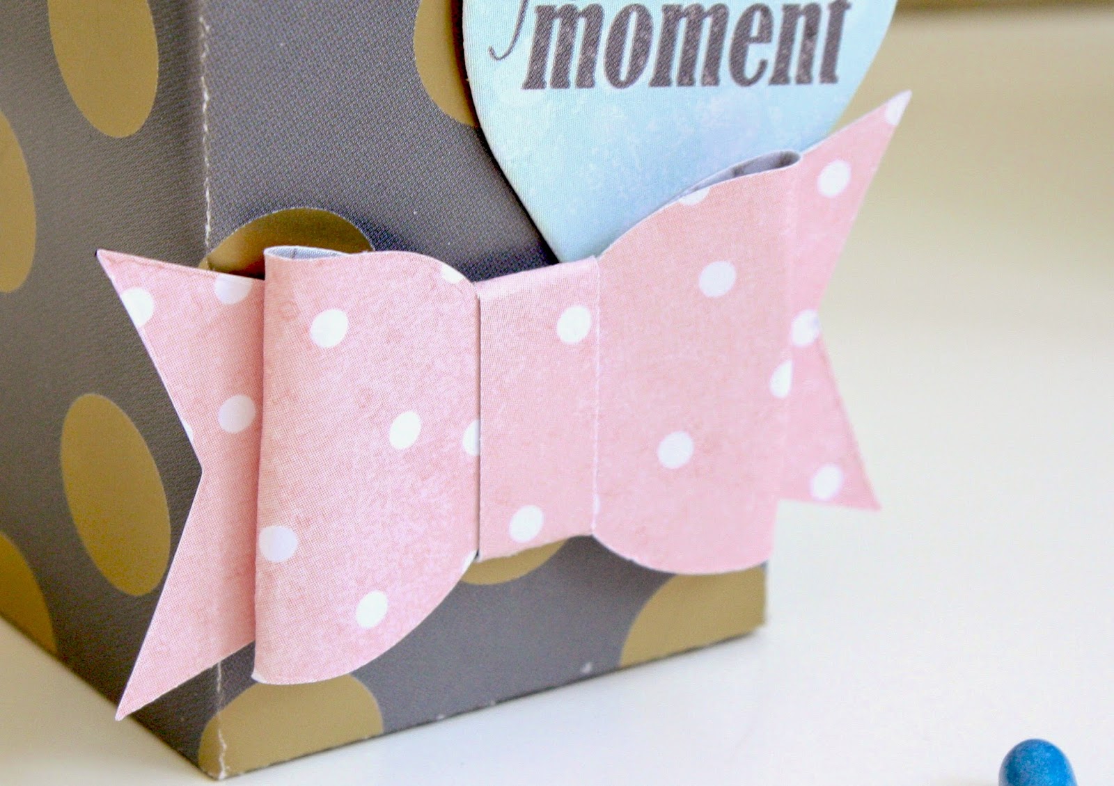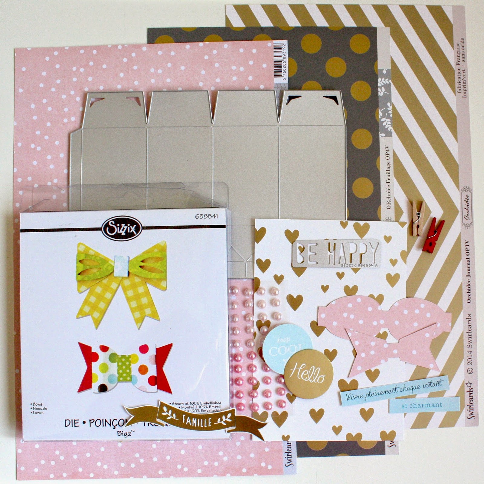 Pour décorer le trio de boîtes, j'ai joué avec les volume en donnant du relief grâce au Die rosace et au die noeud, découpés dans des couleurs pastels pour adoucir le doré. Et j'ai utilisé du ruban adhésif à paillettes pour la découpe Happy afin de rappeler le côté pétillant du doré.
