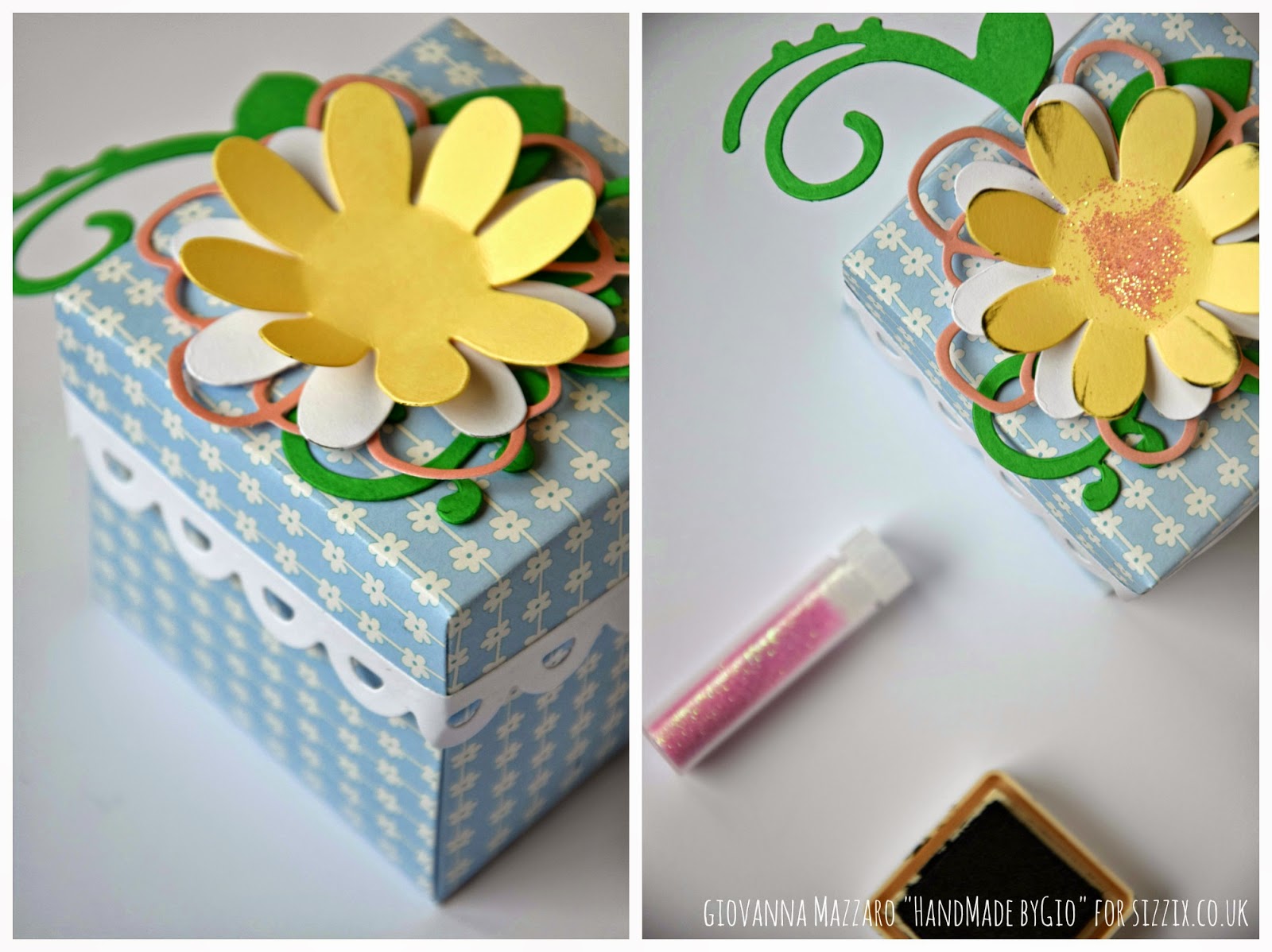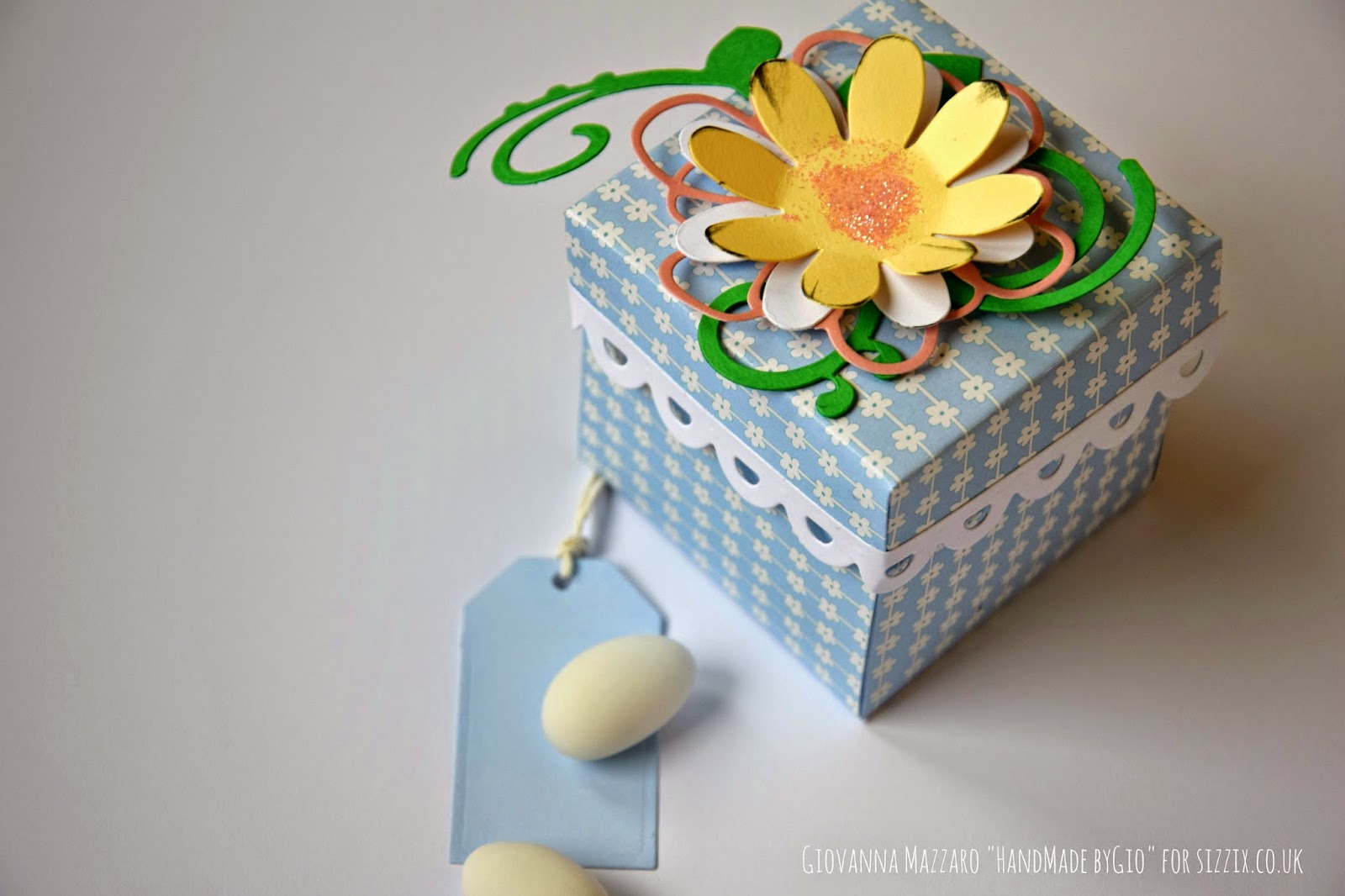 Fustellare la piccola scatola usando il cartoncino Celeste con fiori bianchi della Craft Asylum.