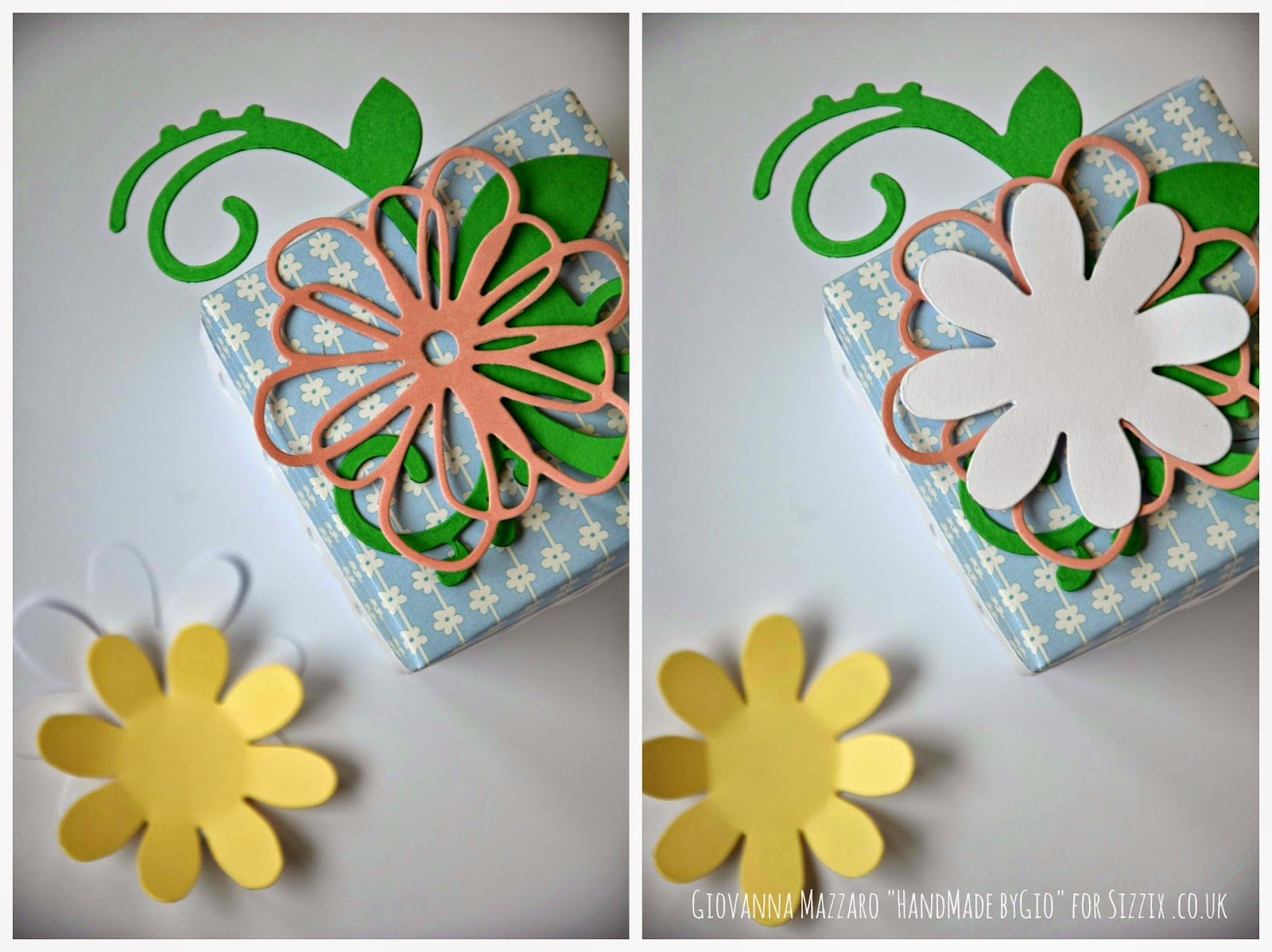 Ora fustellare l'altro fiore con Sizzix Bigz Die - Flourish, Floral w/Leaves 656520, usando i cartoncini bianco giallo e verde.