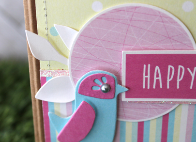 Los colores de estos papeles son ideales para esta celebración. He cosido el papel del fondo y para transmitir el mensaje he troquelado este pajarillo con el trorquel "Love Bird" el resultado es un dulce pajarito.