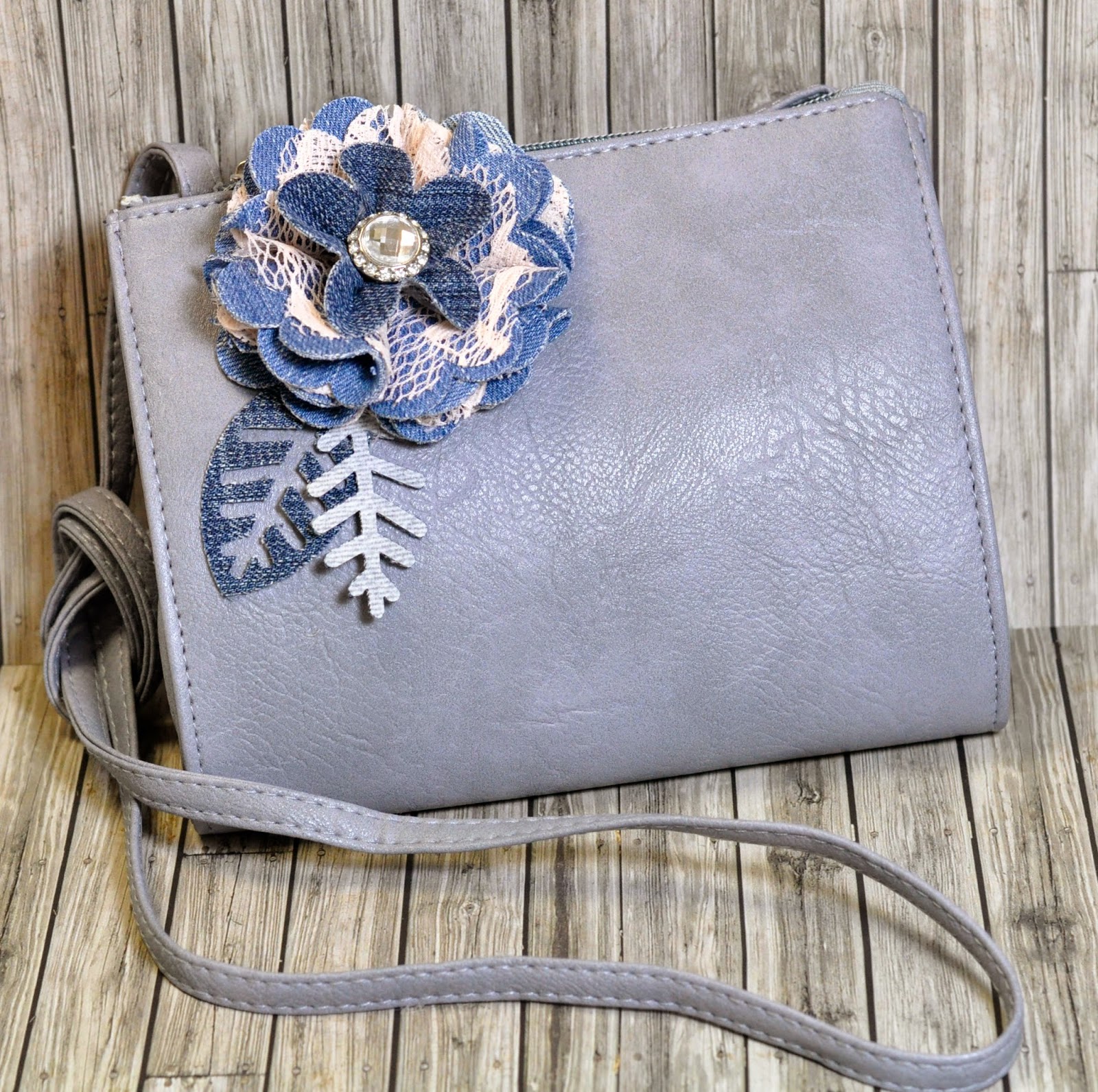 I raided the local charity shops and left with a grey clutch bag, two pairs of jeans and some lace fabric (I get the funniest looks!!). I cut away the seams in the legs of the jeans and layered two strips of denim back to back, I put a sheet of Bondaweb in between the strips and applied a hot iron. Having that double thickness will give my flowers more spring or body, and another advantage of using the heat fusible web stops the fabric from fraying when die-cut.