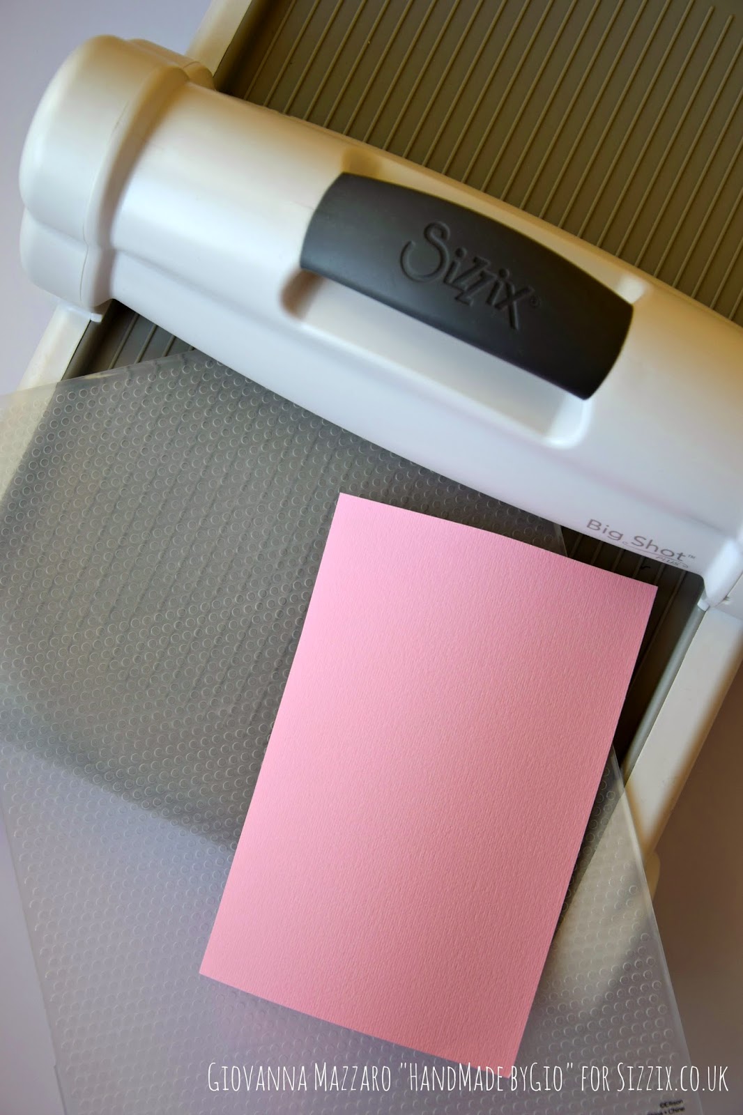 Embossing pink cardstock with Textured Impressions Plus Embossing Folder included in Sizzix Big Shot Starter Kit 660515 and die cut flower using Bigz L Die everiday Essential included in Sizzix Big Shot Starter Kit 660515.