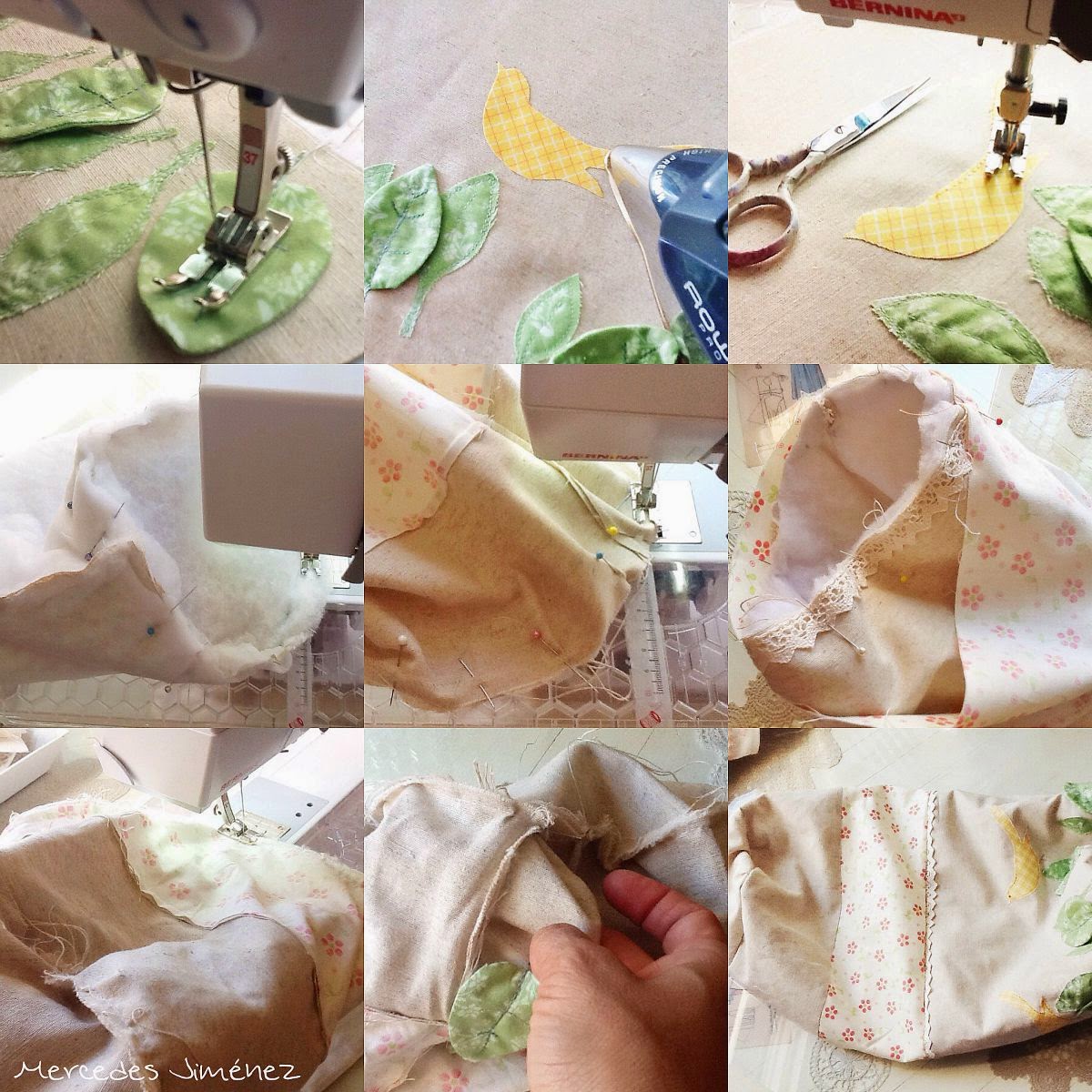 Esas hojas grandes las cosí a la tela de fondo por el centro dejando partes libres. Añadí la guata y monté la bolsa cosiendo los laterales y añadiendo la base.