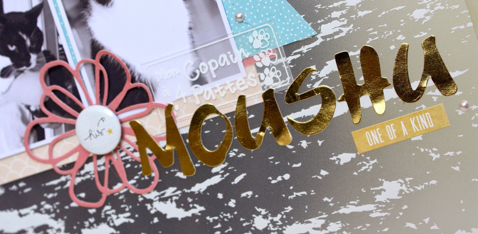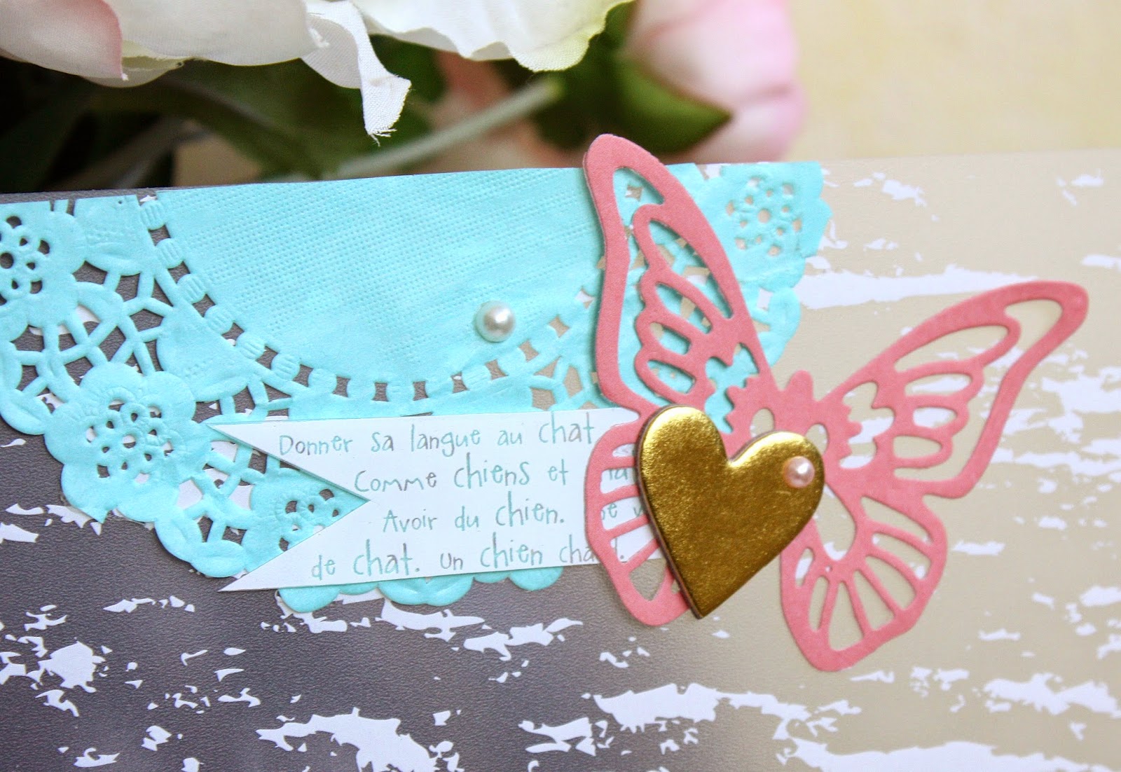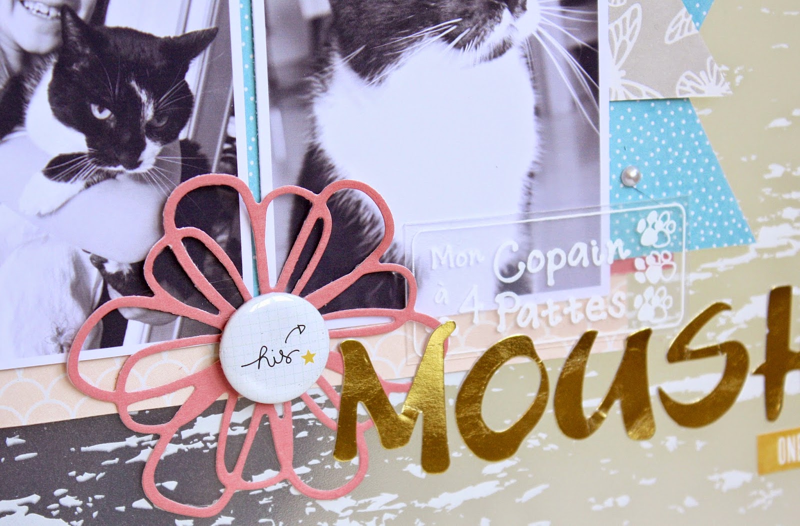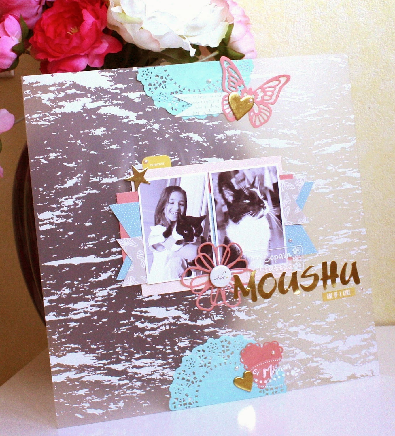 J'ai ajouté de la légèreté avec les dies papillon, fleur et le coeur… J'ai choisi un titre doré et quelques embellissement en relief, comme le badge, les littles dots et les chipboards coeurs et étoile.