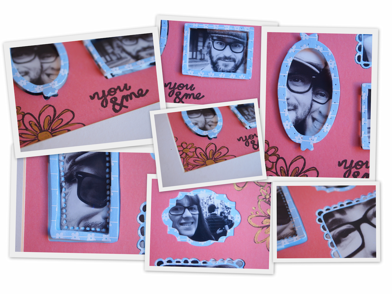 I think they have a lot of possibilities, and my first thought was to use in a easy multiple photo frame. Some gold paint, pretty stamps and the papers from the Big Shot Plus Starter Kit are enough to create a beautiful handcraft decoration