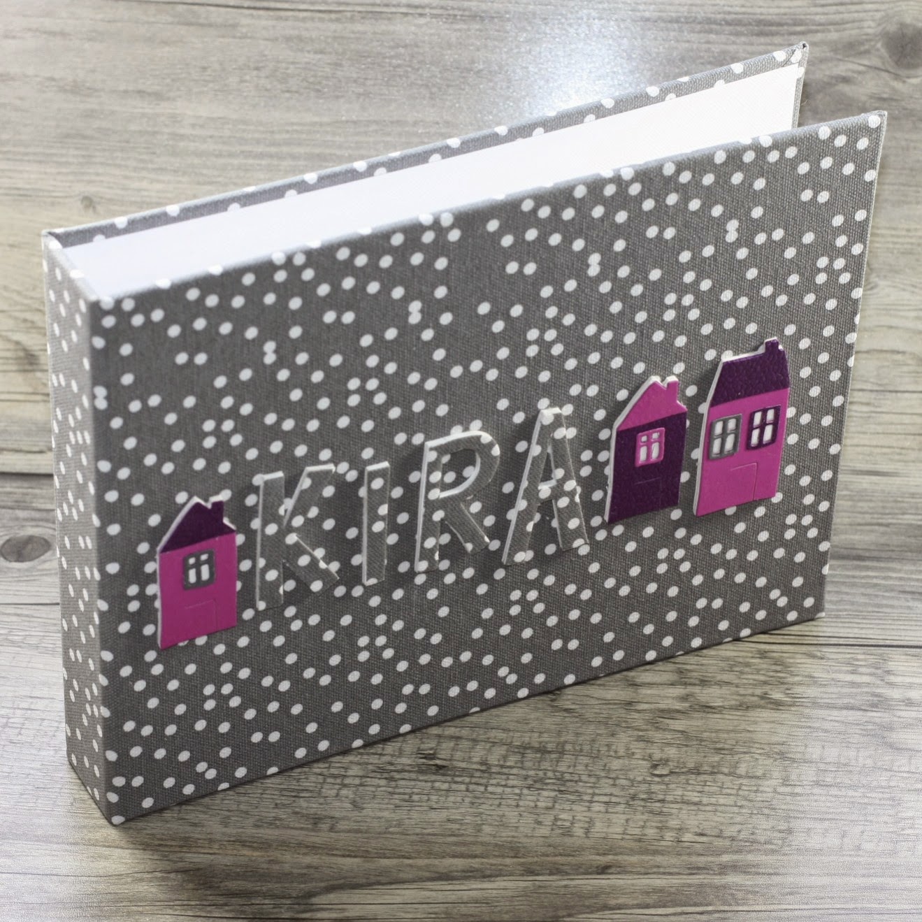 First I cut out her name from thick paperboard, to get really striking letters. I covered the letters with the same fabric of the albumcover. Grey fabric with white dots.... I love it :)