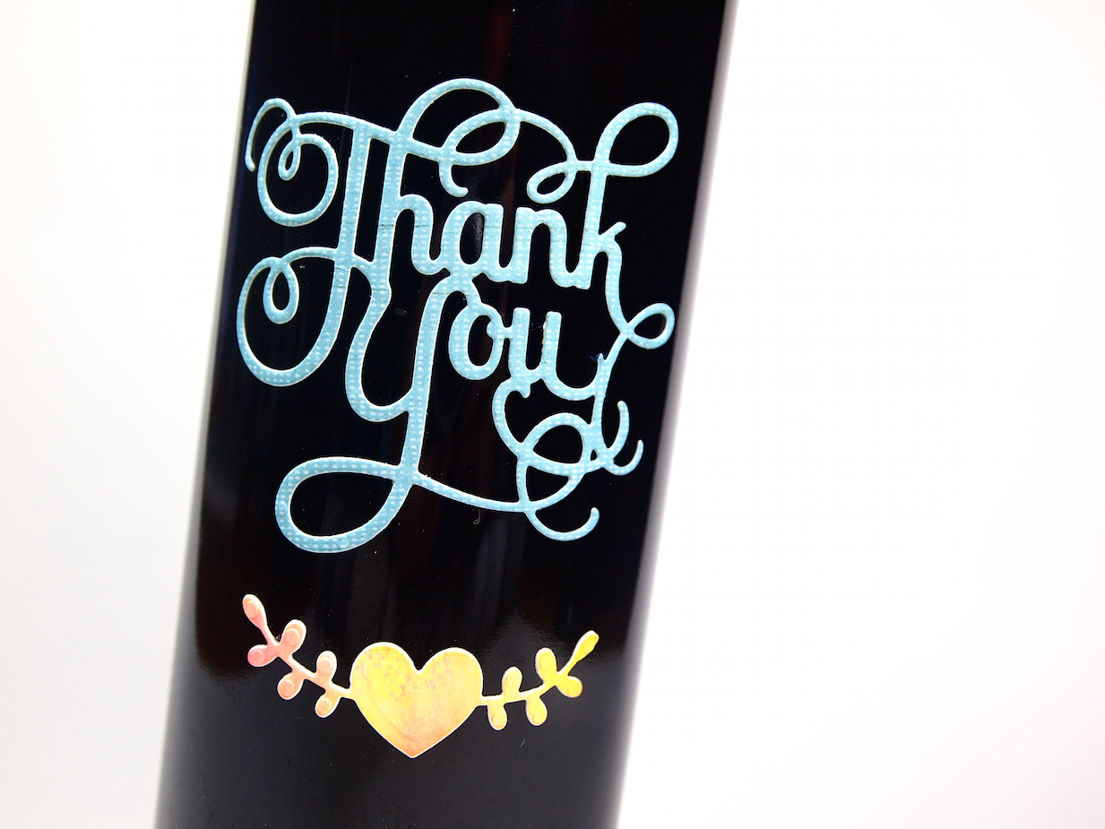 Siempre he tenido dificultades para pegar elementos troquelados en el cristal de la botella, hasta que encontré un pequeño truco: Poner cinta adhesiva de doble cara en la cartulina antes de troquelar.