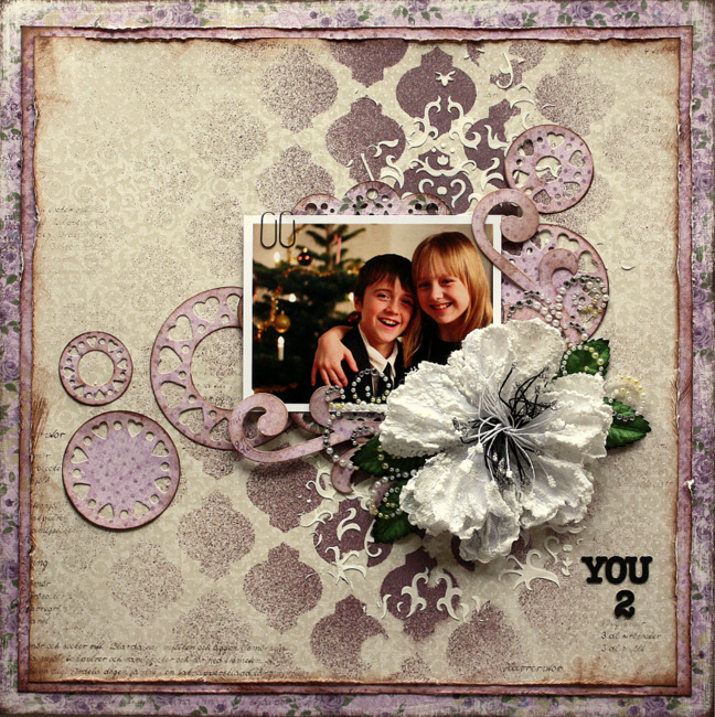 Jag har lekt lite med mina Sizzix dies och skapat en layout om mina barn. För att få ett flöde på sidan har jag använt doilies från setet om 9 st som heter "Doilies, Lovely". Och för att rama in fotot har jag använt swirls från det nya "Classic Icons" setet. Pappren är från Maja Design.