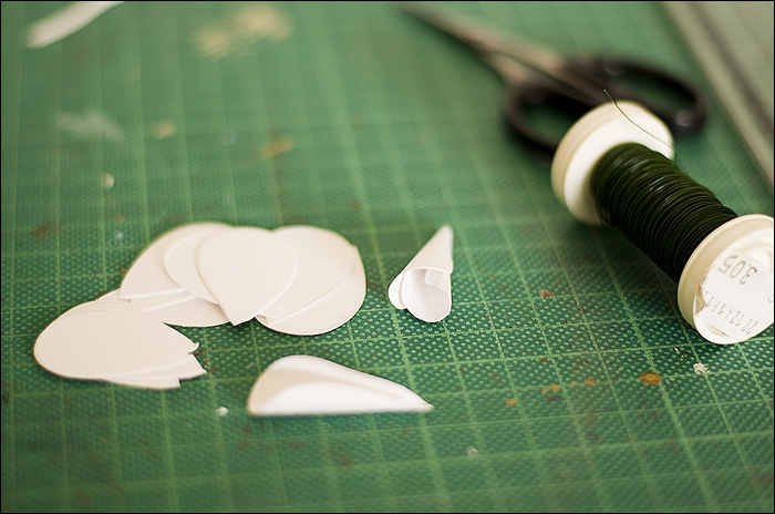Die Blätter habe ich in seine Einzelteile geschnitten und die so entstandenen Blätter aufgerollt.