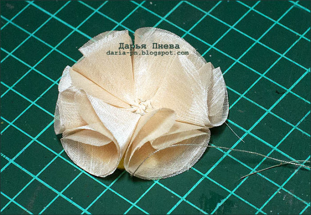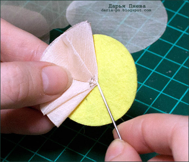 2. Затем я создала цветы, складывая круги из органзы в лепестки и пришивая их к кругу из фетра.
