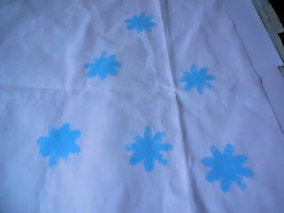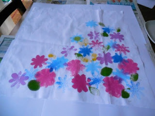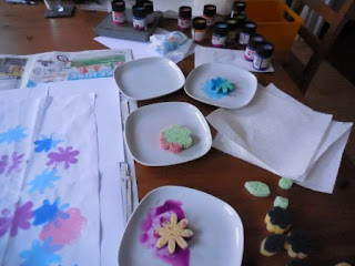 I had planned to decorate some t-shirts for my grandchildren - but decided to see how it all worked on some plain cotton. so I laid out newspaper and then plain paper on my dining room table and selected some fabric dyes, along with some plates, and plenty of kitchen roll I was ready to roll!