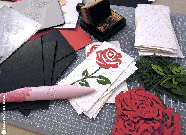 Primero he engofrado la cartulina blanca y entintado el relieve para dar una gran profundidad, después he troquelado la rosa con cartulina roja y verde y la he pegado sobre la cartulina blanca. Finalmente he creado un doble marco con cartulina roja y negra y ya está terminado. Rápido y sencillo :)