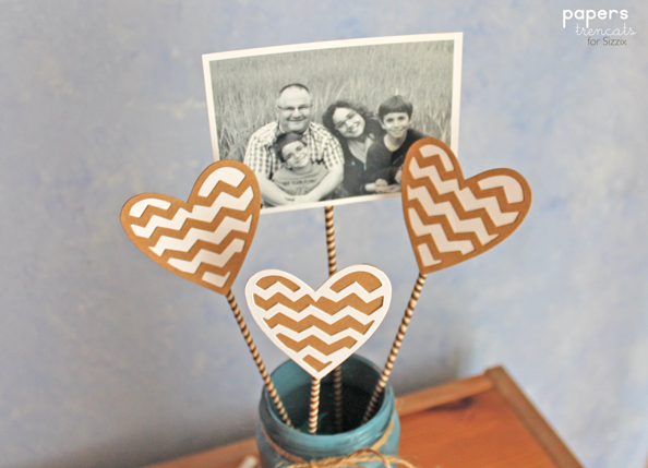 Then I’ve die-cut some kraft and white cardstock hearts and combine them to create heart flowers. I’ve also decorated wooden skewers with a decorative ribbon.
