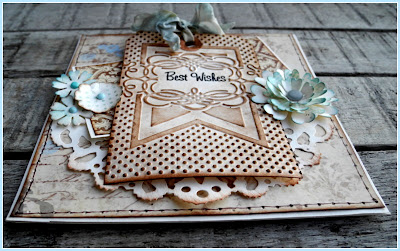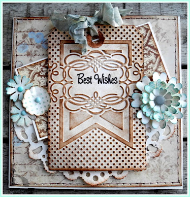 3. I used four different sorts of dies, starting with -Tag & bookplates-, embossing the tag using embossing Folder -Banner-. Decorated with Flowers set- Flower, Lovely-, lace -Distressed Doily dies- and ribbon.
