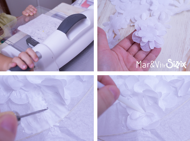 Doblar el papel de seda varias veces y cortar con la Big Shot y el troquel de flores. En una sola pasada cortaremos muchas flores!
