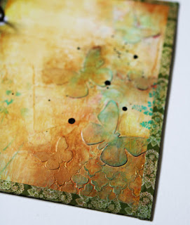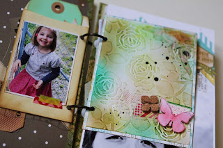 Je me suis également amusée à embosser du papier blanc. Un Bristol au format 10,5x13,5cm est embossé à sec avec un motif floral Sizzix , il sera ensuite matté avec le papier imprimé bleu ciel.J'ai coloré ma page avec des encres Adizondack vertes et corail.