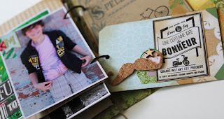 While the covers are drying, cut some accents out of cork with your Big Shot. You’ll need to use Bigz dies to cut out of material such as cork or cloth. I chose small flowers, hearts and a moustache to embellish a picture of Maxence! Create your own stock before starting the decoration of your mini book