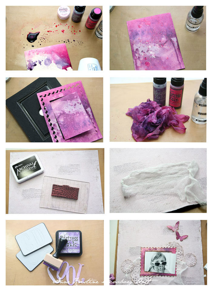 Distress Manila kraft cardstock med Distress Stain - Picked Rasberry, Dusty Concord, Perfect Pearls - Pink Gumball og vann.