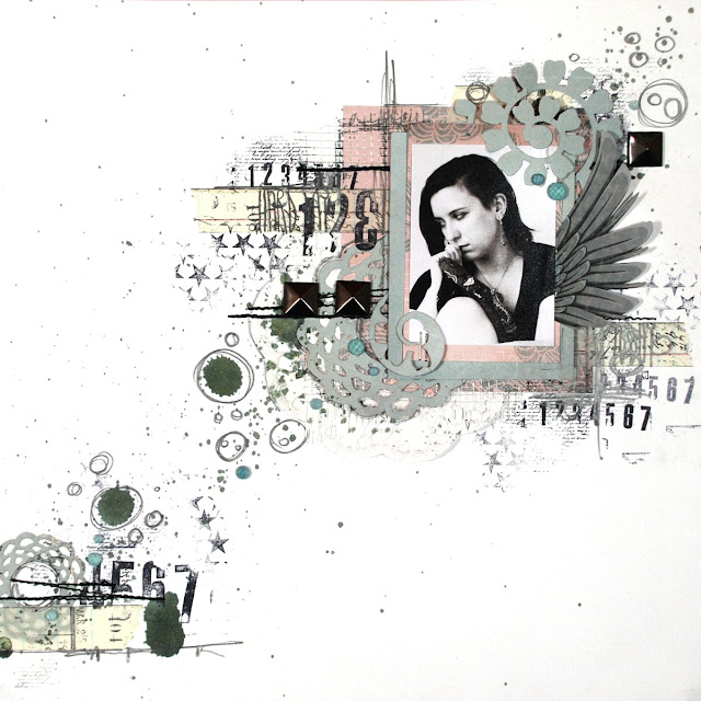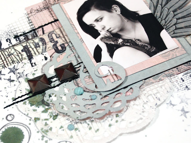 I can't stop being amazed how easy it is to create a layout using Sizzix dies to make some main parts of the composition! If you have your background done and papers chosen - and a have a look on your dies - you will always come with plenty of ideas! I got inspired by very subtle,muted color palette of 7 Dots Studio Papers (Queen's Heart Collection) and 2 lovely Sizzlits Dies from Scrappy Cat collection: Vintage Doily and Flower - Bloom with Leaves.
