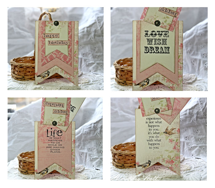 Die cut Banners with patterned paper and stamp some text. Put it together with brads.