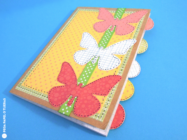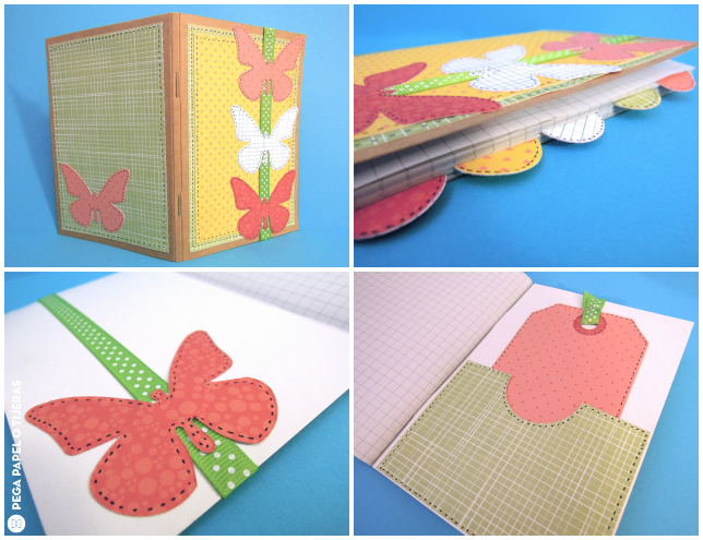 Empieza por pegar un poco de papel decorado y cinta decorativa a las tapas de la libreta. Después troquela algunas mariposas y págalas en las tapas para adornarlas. No te ovides de pegar una en la parte interior para ocultar la junta de la cinta. Para hacer las pestañas solo tienes que troquelar algunos círculos y pegarlos en los extremos de algunas de las páginas. Para hacer el bolsillo corta un trozo de papel a la medida, troquela solo medio círculo en la parte superior y pégalo a la parte interior de la contraportada poniendo pegamento en los laterales y la parte inferior del papel. Como toque final repasa todos los elementos con rotulador negro para que resalten más.