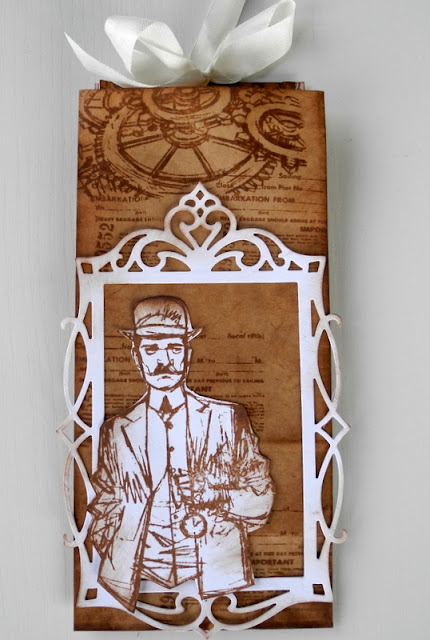 3. Cut a piece of a paperbag 7,5x 16,5 cm, glue to the center of the white cardstock ( tag )