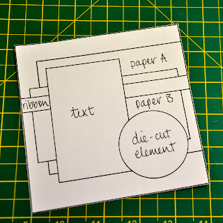 So this basic sketch is designed around a square card blank folding along the top, for each design there are two patterned papers, a die-cut element or motif, a text panel and a length of ribbon (or twine). In addition to this you will see that two small elements have been added such as buttons, brads etc.