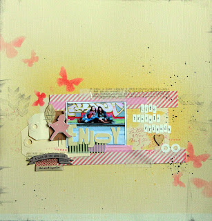 Je me suis donc amusée avec ce nouveau pochoir et mes encres en spray ! J'ai travaillé mon fond pratiquement ton sur ton en vaporisant du Glimmer couleur Sunshine. J'ai construis ma page tout autour en rajoutant quelques chutes de papier, des tags, et quelques embellissements.