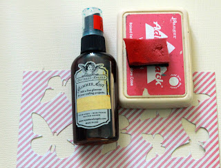 Afin de bien faire ressortir mes papillons, je me suis servie du même pochoir 100% fait main et j'ai retravaillé quelques formes cette fois-ci avec une encre Adirondack ( watermelon) et un morceau de cut'n dry.