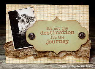 4. Cut the Styled Label from grungeboard. Stamp quote from 'Vintage Automobiles DDRS033' stamp set onto the label using Archival Sepia ink pad. Sponge the edges of the grungeboard lightly with Sepia ink using an ink blending tool.
