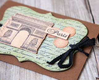 5. Stamp Arc de Triomphe from the DDRS050 Champs Elysee stamp set onto Fawn Cardstock with Jet Black ink. Trim and sponge edges with Vintage Photo Distress Ink. Adhere to left side of grungeboard.