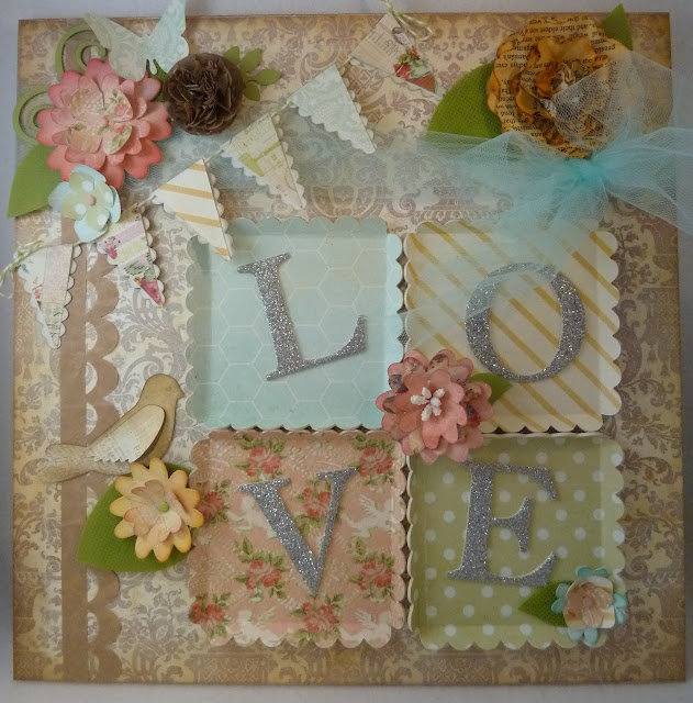 ...and a layout using my 3D flowers cut from Prima papers... We cut the four scalloped squares from matboard (from the Cupcake Stand) after covering them with paper, then added glitter letters and a random sprinkling of paper flowers. The edges of the squares were folded up for some dimension. The flowers were made using the Heart Flower. We folded brown packing paper in thirds and placed inside the fold on the Borders & Hydrangea die to create a border that ran the length of the scrapbook page.