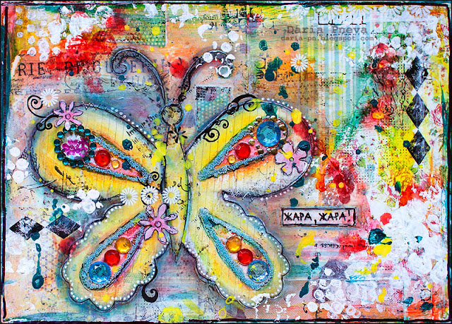 To create background I used different papers, stencils, acrylic paints, alcohol inks, stamps. I cut the butterfly using Butterfly #3 die. I decorate it using micro beads, crystals, rub-ons and doodling.
