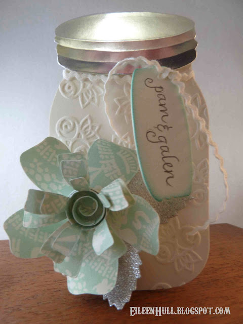 Place on a piece of foam and trace over the lines with an embossing stylus. Adhere to the top of the jar using foam dots for dimension.