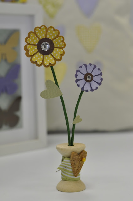Today I want to share with you some home decor ideas using the new Big Shot Starter Kit. It is so easy to forget that as useful as the Big Shot is for creating cards and scrapbook layouts, it is capable of creating so much more...my ideas are relatively simple and I am certainly not an expert when it comes to stitching but that goes to show that if I can achieve projects like this then anyone can! The heart used here to decorate the cotton reel was cut out of an old cork tile, I thought it may struggle going through the Big Shot but I needn't of worried!