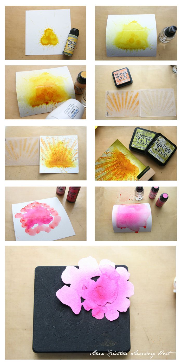 Ink akvarell papir med Distress Stain - Picked Raspberry, Worn Lipstick og spray vann over og tørk med varmepistol