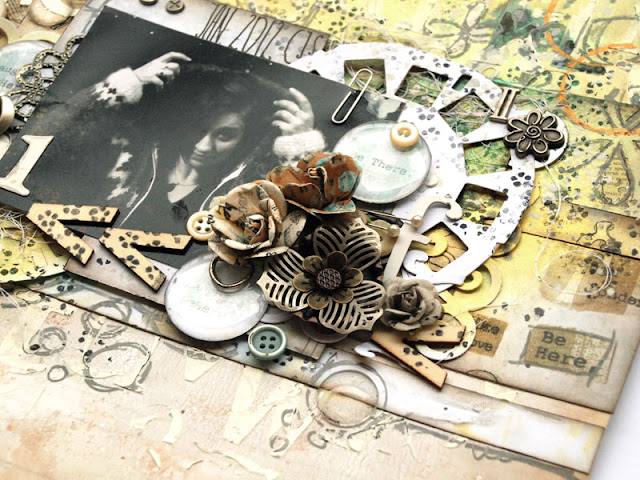 Here is finished project - I used some older and some new Sizzix Tim Holtz dies, which were used both traditionally and in unconventional way - to create a stencil to make some extra pattern in the background of the project. To add extra texture I used decorative strip from Dena Designs.