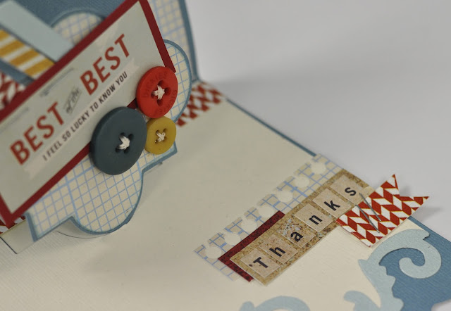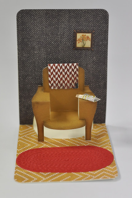 I have created this card in quite masculine colours because I am always thinking of a solution to every crafters puzzle...what to do when faced with making a card for the men in your life! The wide arms of the pop-up chair are quite accommodating and perfect for adding personality to the card. I have added a newspaper which is what I would find on the arm of my Dad's chair but for a female version, change the colours and maybe add a miniature ball of wool with cocktail stick knitting needles?